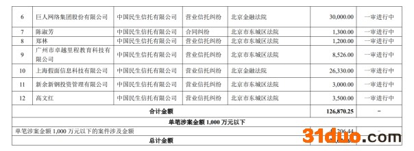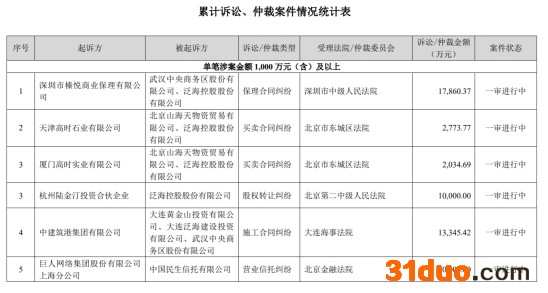 4月6日,泛海控股公布累计诉讼、仲裁情况。截至本公告披露日,除已披露过的诉讼、仲裁案件外,公司及公司控股子公司连续12个月内累计诉讼、仲裁涉案金额合计17.31亿万元,占公司最近一期经审计净资产166.06亿元的10.42%。其中涉案金额最高案件为巨人网络集团股份有限公司起诉,被起诉方为中国民生信托有限公司,诉讼/仲裁类型为营业信托纠纷,涉及金额为3亿元。