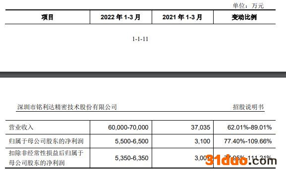 铭利达预计2022年1-3月实现营业收入的区间为60,000万元至70,000万元,同比增长62.01%至89.01%;实现归属于母公司股东的净利润的区间为5500万元至6500万元,同比增长77.40%至109.66%;扣除非经常性损益后归属于母公司股东的净利润的区间为5350万元至6350万元,同比增长77.95%至111.21%。铭利达表示,前述业绩情况系公司根据2021年度已实现业绩数据以及在手订单情况、预计实现收入的毛利率情况、预计发生的费用率情况等多方面因素做出的预计数据,未经会计师审计或审阅,且不构成公司的盈利预测或业绩承诺。