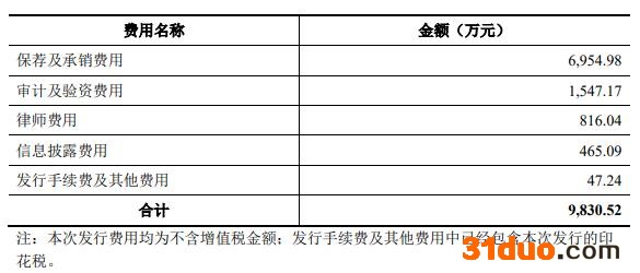 铭利达本次发行费用总额(不含增值税)为9830.52万元,国泰君安证券股份有限公司获得保荐及承销费用6954.98万元。