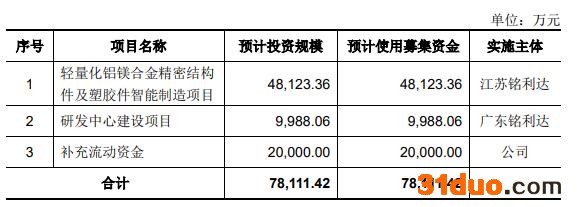 铭利达本次发行新股募集资金总额为11.40亿元,募集资金净额为10.42亿元。公司最终募集资金净额比原计划多2.61亿元。2022年3月31日,铭利达披露的招股书显示,公司拟募集资金7.81亿元,分别用于轻量化铝镁合金精密结构件及塑胶件智能制造项目、研发中心建设项目、补充流动资金。