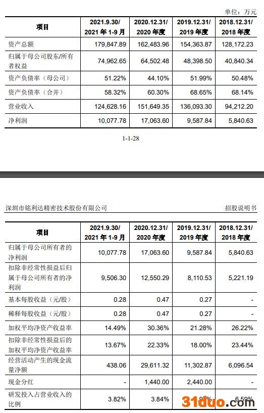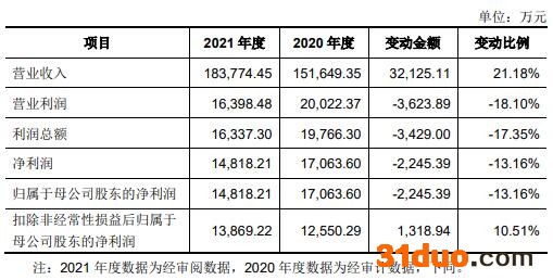 2021年度,铭利达实现营业收入183,774.45万元,同比增长21.18%;归属于母公司股东的净利润实现14,818.21万元,同比减少13.16%;扣除非经常性损益后归属于母公司股东的净利润实现13,869.22万元,同比增长10.51%;经营活动产生的现金流量净额11,476.68万元,同比减少61.24%。