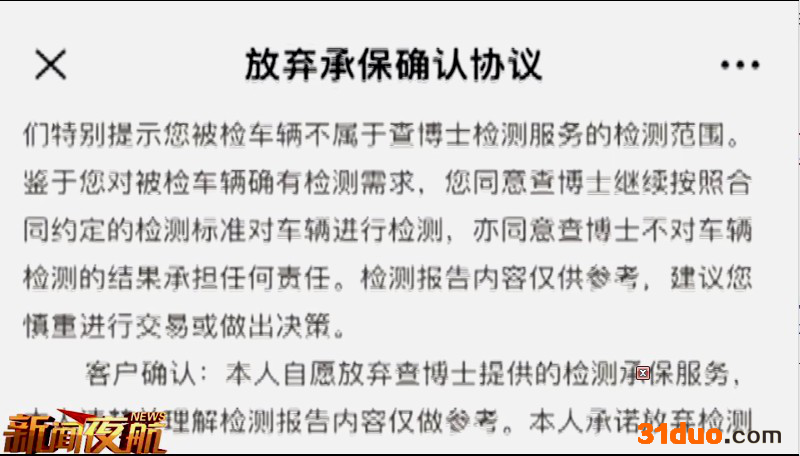 记者注意到,上述报道中提到了消费者与查博士平台签署了“放弃承保确认协议”,该协议显示“查博士不对车辆检测的结果承担任何责任,检测报告内容仅供参考,建议您慎重进行交易或作出决策”。有业内人士认为,“查博士”提供检测服务,却不对检测结果承担责任的做法属于“霸王”行为。