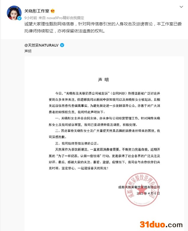 中新经纬4月7日电 “关晓彤及关联奶茶公司被起诉”的微博话题6日引发热议,涉事奶茶公司成都天然呆餐饮管理有限公司及关晓彤工作室6日深夜回应表示,关晓彤并非合同主体,未参与公司经营管理工作。