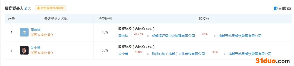 天眼查APP显示,成都天然呆餐饮管理有限公司成立于2020年8月,旗下的“天然呆奶茶”是携手关晓彤创立的新茶饮品牌。关晓彤的父亲关少曾间接持有该公司35%股份。