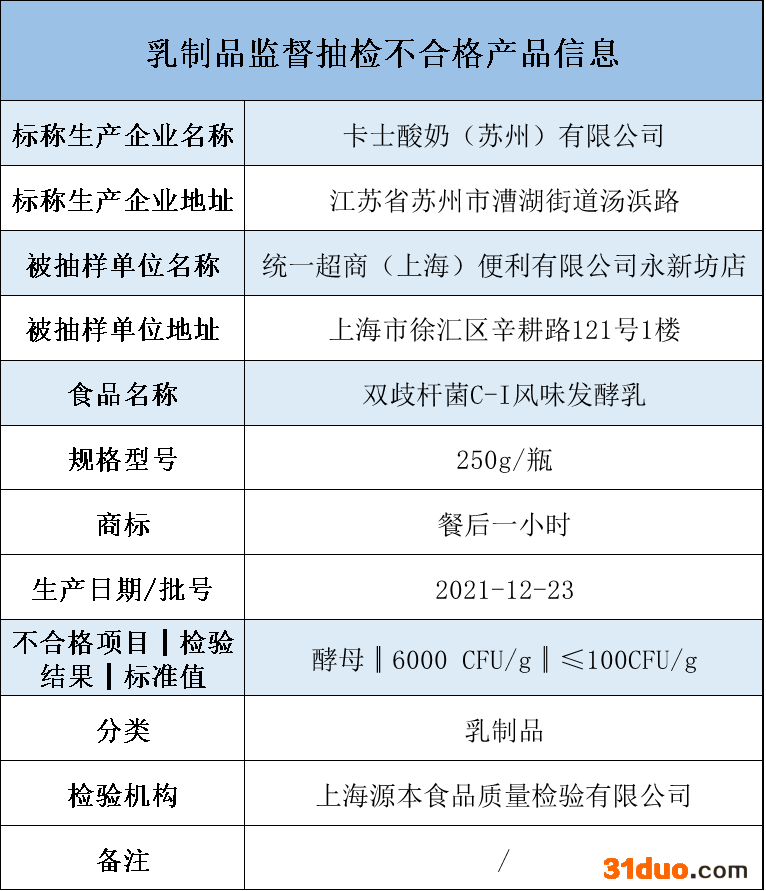 中国网财经4月7日讯(记者 钟文鑫)据上海市市场监督管理局微信公众号4月6日晚间发布的食品安全抽检信息,1批次卡士酸奶(苏州)有限公司生产、统一超商(上海)便利有限公司永新坊店销售的双歧杆菌C-I风味发酵乳抽检样品不合格,不合格项目为酵母。