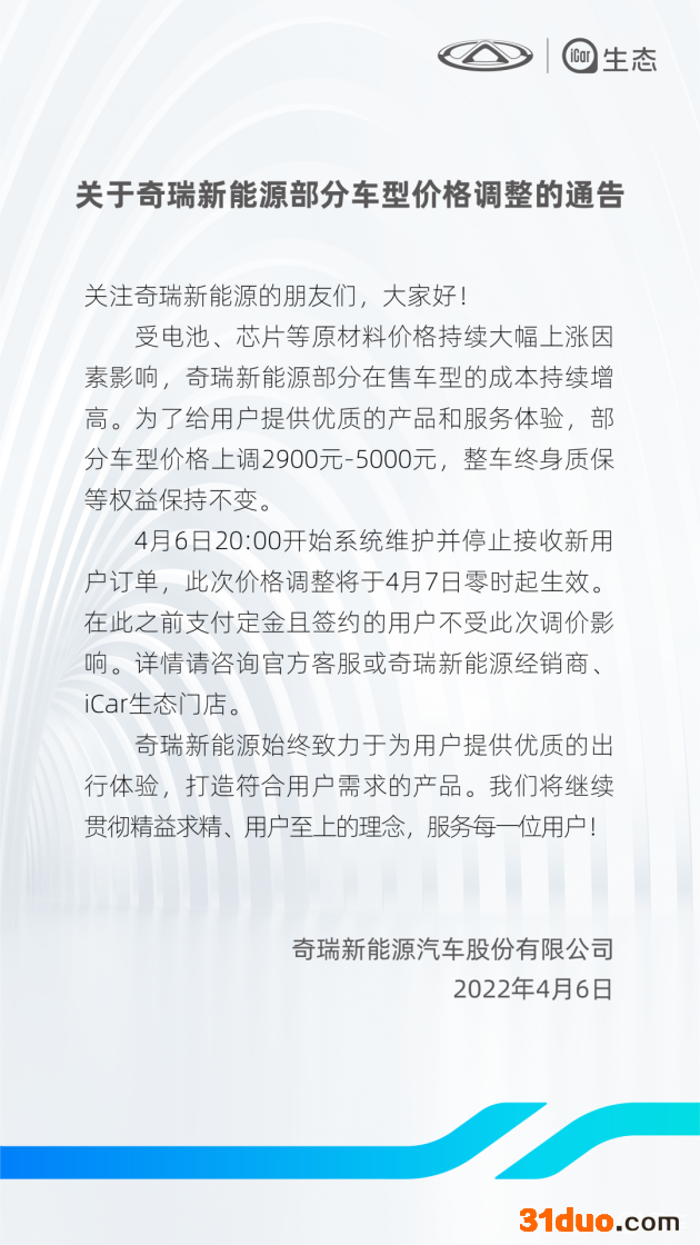 4月6日,奇瑞新能源宣布对旗下部分新能源车型价格上调2900-5000元。系统自4月6日20点维护并停止接受新用户订单,价格调整将于4月7日零点生效。