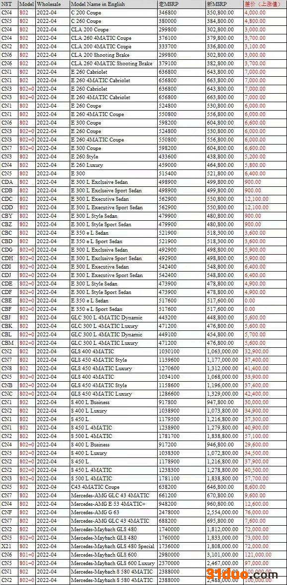具体到品牌方面,梅赛德斯-奔驰决定自2022年4月2日起对部分在售车型厂商建议零售价格进行调整,涨价车型包括进口C级、E级、S级、GLS以及部分迈巴赫和AMG车型等;国产车型包含长轴E级和GLC L等产品。