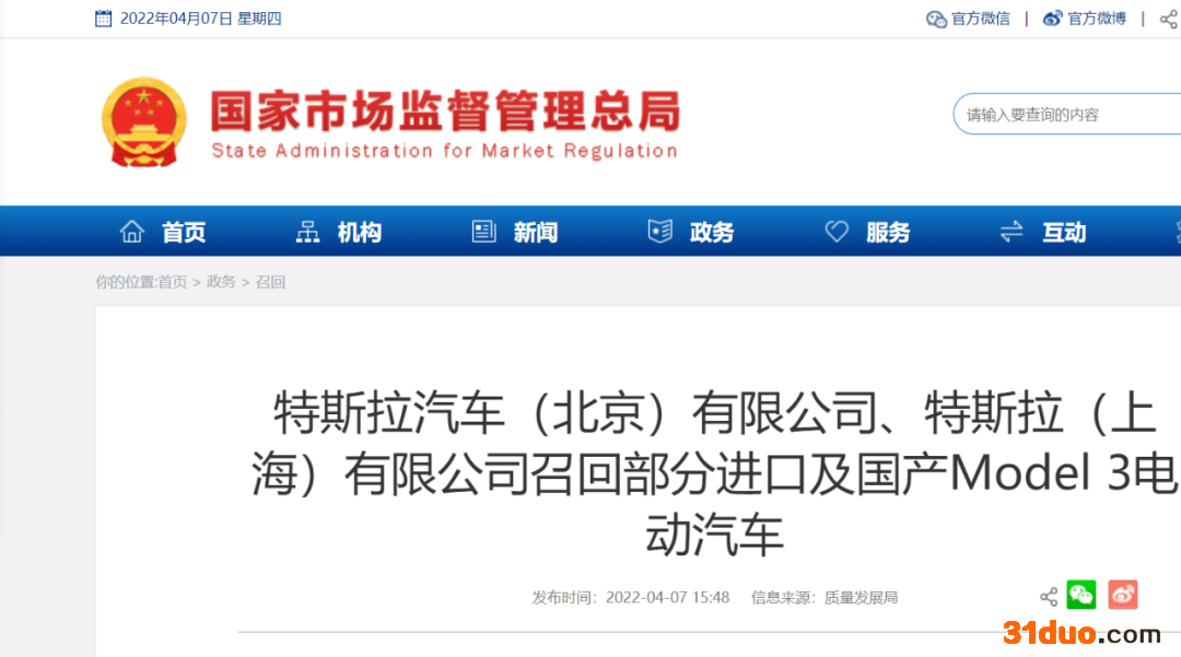 自4月7日起,特斯拉将召回生产日期在2019年1月11日至2022年1月25日期间的部分进口及国产Model 3电动汽车,共计127785辆(其中进口Model 3汽车34207辆,国产Model 3汽车93578辆)。