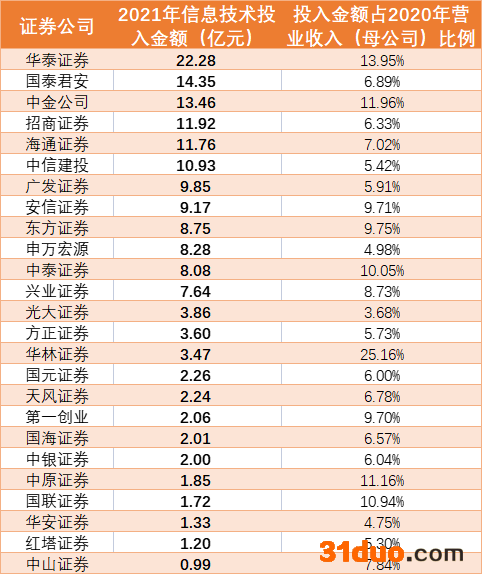 值得一提的是,按照证券业协会统计数据,2020年证券行业信息技术投入金额平均数为2.58亿元。目前,在前述记者统计的25家券商中,共有15家超过2020年的平均数。