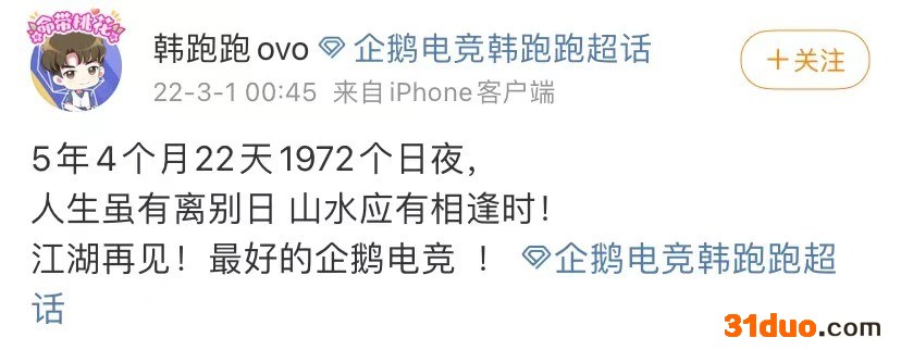 今年3月初,拥有超700万粉丝的大主播韩跑跑发文称:“5年4个月22天,1972个日夜,人生虽有离别日,山水应有相逢时。江湖再见,最好的企鹅电竞。”