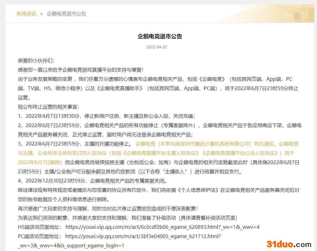 公司表示,由于业务发展策略的变更 ,企鹅电竞相关产品包括《企鹅电竞》(包括网页端、App端、PC端、TV端、H5、微信小程序)以及《企鹅电竞直播助手》(包括网页端、App端、PC端),将于2022年6月7日23时59分终止运营。