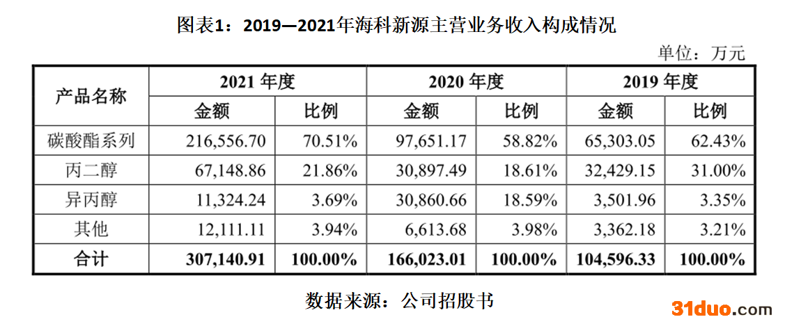 2019—2021年(以下简称“报告期内”),海科新源主营业务收入分别为10.46亿元、16.6亿元、30.71亿元,呈快速增长趋势。其中,碳酸脂系列产品为该公司核心产品,报告期内,该产品的收入占比分别为62.43%、58.82%、70.51%。