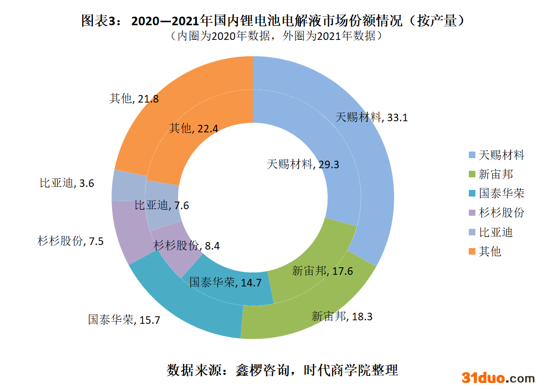 据天赐材料2019年12月13日《关于投资建设年产15万吨锂电材料项目的公告》,该公司计划投资3.19亿元用于新建年产6万吨液体六氟磷酸锂装置、年产7万吨溶剂装置、年产15万吨电解液木叶配置装置。其中,年产7万吨溶剂装置包括DMC、EMC两种碳酸酯类溶剂。据该公司2021年11月6日公布的项目进展公告,该项目已正式投料,进入试生产阶段。2021年年报资料显示,该公司预计将于2022年6月30日大量投产。