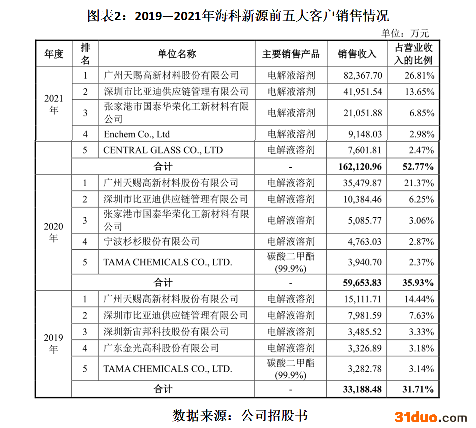 目前,国内锂离子电池电解液行业集中度较高,排名前三的天赐材料、新宙邦、国泰华荣的市场份额超60%,且上述三家企业的市场份额正在逐步提升。受行业集中度的影响,海科新源报告期内的第一大客户连续三年为天赐材料(002709.SZ),且销售收入及占比呈逐年大幅增长趋势;此外,新宙邦(300037.SZ)、国泰华荣也出现在该公司主要客户名单中。