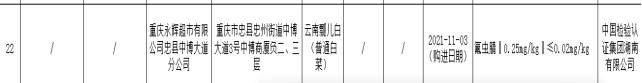 本次抽检发现,重庆永辉超市有限公司忠县中博大道分公司销售的云南瓢儿白(普通白菜),氟虫腈不符合食品安全国家标准规定,购进日期2021年11月3日,检验机构为中国检验认证集团湖南有限公司。