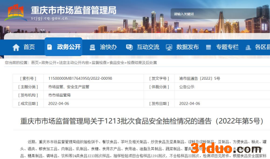 重庆市市场监督管理局网站于4月6日发布的《重庆市市场监督管理局关于1213批次食品安全抽检情况的通告》(2022年第5号)显示,近期,重庆市市场监督管理局组织抽检饼干、餐饮食品、茶叶及相关制品、炒货食品及坚果制品、淀粉及淀粉制品、豆制品、方便食品、糕点、罐头、酒类、粮食加工品、肉制品、乳制品等24类食品1213批次样品。抽样检验项目合格样品1191批次,不合格样品22批次。