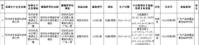 本次抽检的肉制品主要为腌腊肉制品、酱卤肉制品、调理肉制品、熏煮香肠火腿制品、熏烤烤肉制品、熟肉干制品,不合格样品9批次,不合格项目为菌落总数、氯霉素、大肠菌群、胭脂红。其中,微生物污染问题中发现,苏州诗洋食品科技有限公司生产、深圳市永辉超市有限公司平湖凤凰大道店的海苔肉粉松和香酥肉粉松大肠菌群和菌落总数不合格,规格型号均为120克/瓶,海苔肉粉松生产日期2021/10/16,香酥肉粉松生产日期2021/9/22,检验机构均为广东产品质量监督检验研究院。