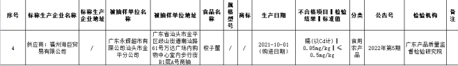 此外,本次抽检的食用农产品主要为蔬菜、畜禽肉及副产品、水产品、水果、鲜蛋,不合格样品9批次,不合格项目为镉(以Cd计)、呋喃西林代谢物、氯霉素。其中,重金属污染问题中发现,福州海巨贸易有限公司供应的、广东永辉超市有限公司汕头市金平分公司销售的梭子蟹镉(以Cd计)不合格,检验结果0.85mg/kg,标准值≤0.5mg/kg,购进日期2021年10月1日,检验机构广东产品质量监督检验研究院。