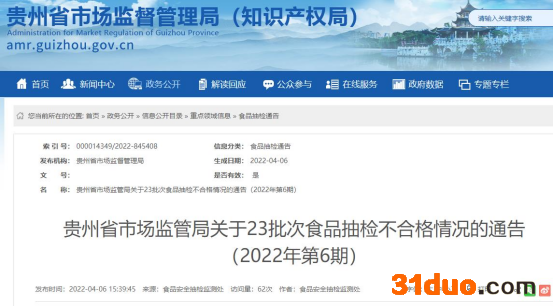 贵州省市场监督管理局(知识产权局)网站于4月6日发布的《贵州省市场监管局关于23批次食品抽检不合格情况的通告》(2022年第6期)显示,近期,贵州省市场监管局组织食品安全监督抽检,抽取餐饮食品、茶叶及相关制品、炒货食品及坚果制品、豆制品、蜂产品、糕点、冷冻饮品、肉制品、食品添加剂等13大类食品807批次样品,检出6大类食品中23批次样品不合格。不合格项目涉及大肠菌群、黄曲霉毒素B1、吡虫啉、甲胺磷、甲基异柳磷、亚硝酸盐(以亚硝酸钠计)、阴离子合成洗涤剂(以十二烷基苯磺酸钠计)、酸价(以脂肪计)、过氧化值(以脂肪计)、总糖分等。
