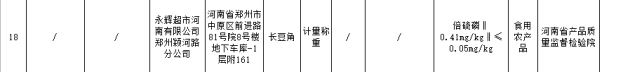 本次抽检发现,永辉超市河南有限公司郑州颖河路分公司销售的1批次长豆角,倍硫磷不合格,检出值为0.41mg/kg,标准规定为不大于0.05mg/kg。检验机构为河南省产品质量监督检验院。