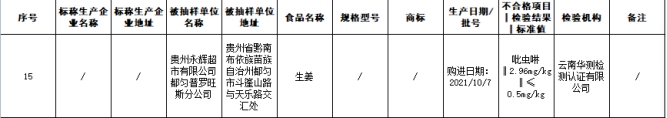 本次抽检发现,贵州永辉超市有限公司都匀普罗旺斯分公司销售的生姜吡虫啉不合格,购进日期2021年10月7日,检验结果2.96mg/kg,标准值≤0.5mg/kg,检验机构云南华测检测认证有限公司。