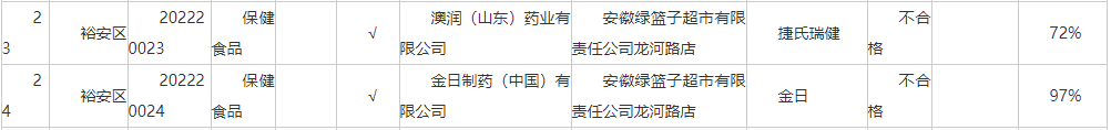 抽查结果显示,1批次不合格商品为标称澳润(山东)药业有限公司生产的、由安徽绿篮子超市有限责任公司龙河路店销售的保健食品“捷氏瑞健”,其包装空隙率为72%。