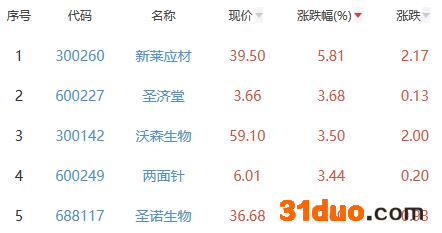 其中,新莱应材、圣济堂、沃森生物、两面针、圣诺生物位列板块涨幅前五位,涨幅分别为5.81%、3.68%、3.50%、3.44%、2.60%。
