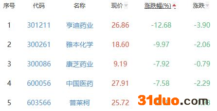 亨迪药业、雅本化学、康芝药业、中国医药、普莱柯位列涨幅榜后五位,涨幅分别为-12.68%、-9.97%、-7.92%、-7.58%、-7.15%。