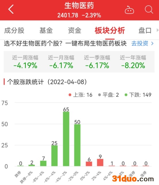 中国经济网北京4月8日讯 今日,生物医药板块整体跌幅2.39%,其中16只股票上涨,2只股票平盘,149只股票下跌。