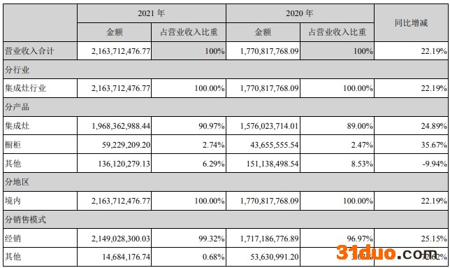 分产品来看,2021年浙江美大集成灶营收19.68亿元,占营业收入比重的90.97%,同比增长24.89%;橱柜营收0.59亿元,占营业收入比重的2.74%,同比增长35.67%;其他业务营收1.36亿元,占营业收入比重的6.29%,同比减少9.94%。集成灶依然是浙江美大的主要收入来源,2021年营业收入虽比去年增长,但毛利率却同比下滑2.39%。