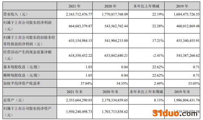 4月7日晚间,浙江美大(002677.SZ)发布2021年度报告。报告期内公司实现营业收入21.64亿元,同比增长22.19%;归属上市公司股东的净利润6.65亿元,同比增长22.28%;经营活动产生的现金流净额6.19亿元,同比减少2.41%,主要系本报告期内用于支付广告宣传促销费增加所致。