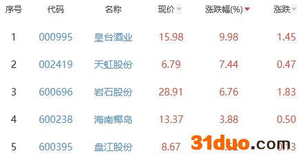 其中,皇台酒业、天虹股份、岩石股份、海南椰岛、盘江股份位列板块涨幅前五位,涨幅分别为9.98%、7.44%、6.76%、3.88%、1.52%。