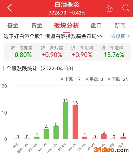 中国经济网北京4月8日讯 今日,白酒概念板块整体跌幅0.43%,其中17只股票上涨,0只股票平盘,24只股票下跌。