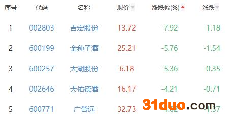 吉宏股份、金种子酒、大湖股份、天佑德酒、广誉远位列涨幅榜后五位,涨幅分别为-7.92%、-5.76%、-5.36%、-4.21%、-4.02%。