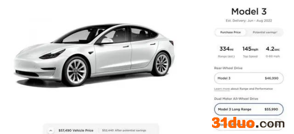 具体来看,Model 3 Long Range(长续航版)的起售价调整至55990美元,相比此前的54490美元上调了1500美元;Model 3 Performance(高性能版)的起售价调整至62990美元,相比此前的61990美元上调了1000美元;Model 3后轮驱动版则没有调价,依然为46990美元。