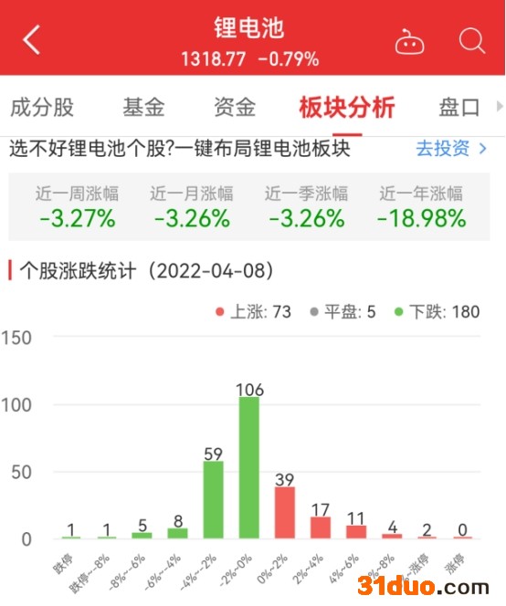 中国经济网北京4月8日讯 今日,锂电池板块整体跌幅0.79%,其中73只股票上涨,5只股票平盘,180只股票下跌。