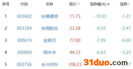 纵横通信、吉翔股份、金银河、翔丰华、永兴材料位列涨幅榜后五位,涨幅分别为-10.03%、-9.59%、-7.99%、-6.83%、-6.70%。