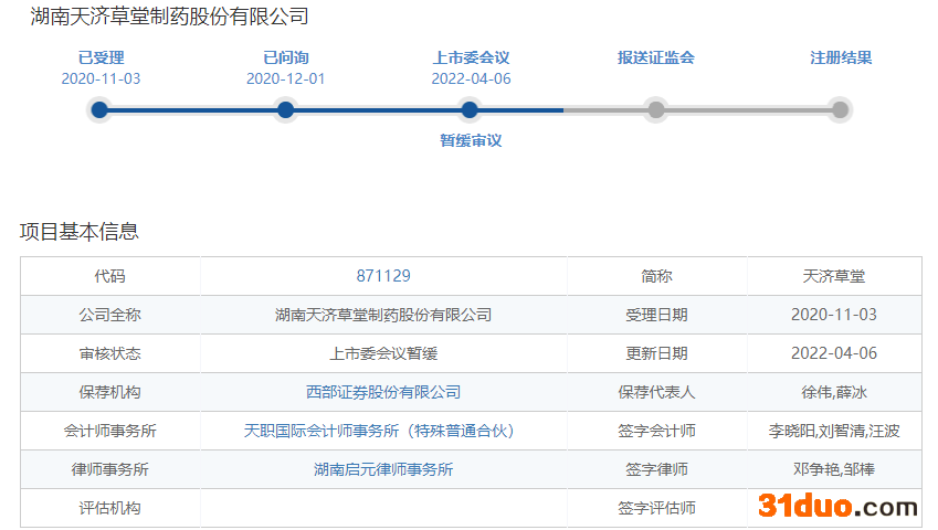 中国网财经4月7日讯(记者 杜丁)昨日,北京证券交易所上市委员会2022年第13次审议会议结果显示,湖南天济草堂制药股份有限公司(“天济草堂”)暂缓审议。