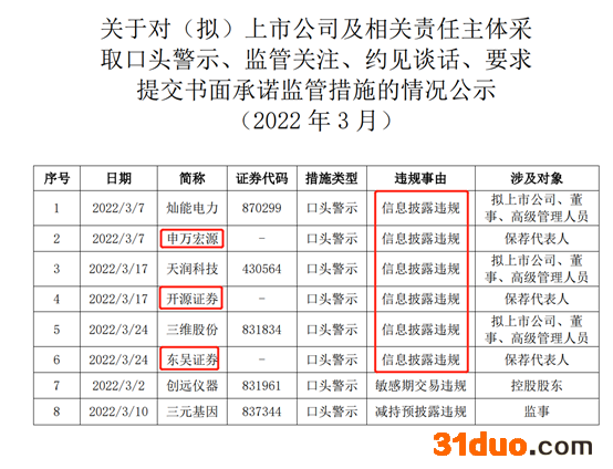 申万宏源、东吴、开源3家券商保代遭口头警示,北交所同天公布8起自律监管函,3家企业或“带病闯关” 2022-04-09 14:49 来源:财联社