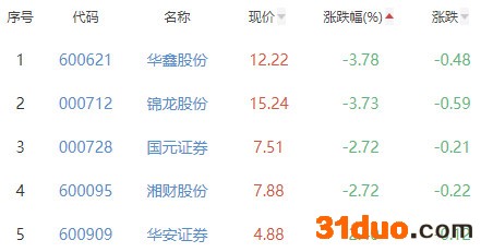 华鑫股份、锦龙股份、国元证券、湘财股份和华安证券位列涨幅榜后五位,涨幅分别为-3.78%、-3.73%、-2.72%、-2.72%和-2.40%。