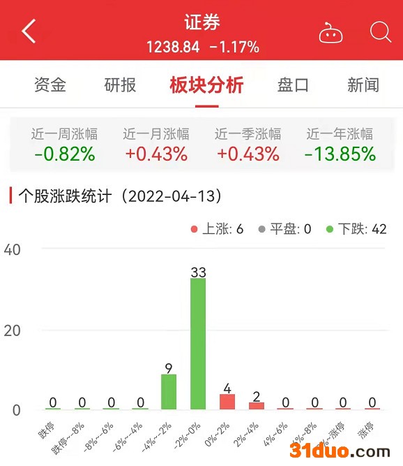 中国经济网北京4月13日讯 今日,证券板块整体跌幅1.17%,其中6只股票上涨,42只股票下跌。