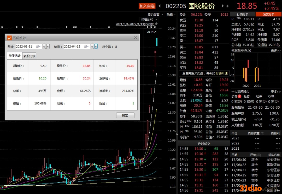 截至收盘,国统股份股价涨2.45%,报18.85元/股。