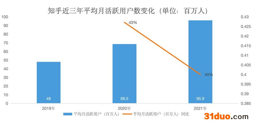 另一方面,2021年,知乎的营销费用同比增长122%,营业成本同比增长了136%,但并没有给用户数量带来同等规模的增长。此外,知乎的平均月活跃用户数、平均月订阅会员数量上的增速都在放缓。2021年,知乎的平均月活跃用户数为95.9百万人,同比增长40%,为近三年最高。但从增速上看,较2020年的43%下降了三个百分点。