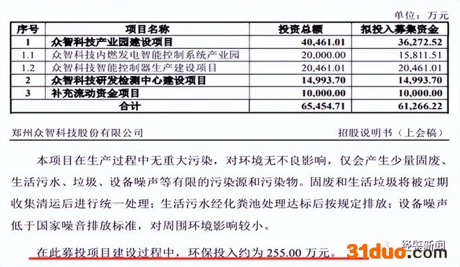 据披露,众智科技募投项目中的“众智科技产业园建设项目”,投资总额40,461.01万元,拟投入募集资金36,272.52万元,环保投入255万元。