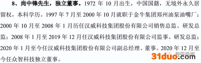 招股说明书披露,尚中锋为众智科技独立董事,2020年1月至今,尚中锋任汉威科技集团股份有限公司副总经理、董事;2020年12月至今任众智科技独立董事。