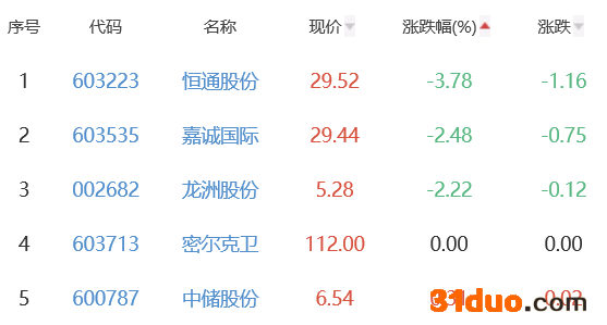 恒通股份、嘉诚国际、龙洲股份、密尔克卫、中储股份位列板块涨幅榜后五位,涨幅分别为-3.78%、-2.48%、-2.22%、0.00%、0.31%。