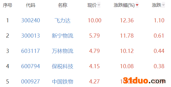 其中,飞力达、新宁物流、万林物流、保锐科技、中国铁物位列板块涨幅榜前五位,涨幅分别为12.36%、11.78%、10.12%、10.08%、10.05%。