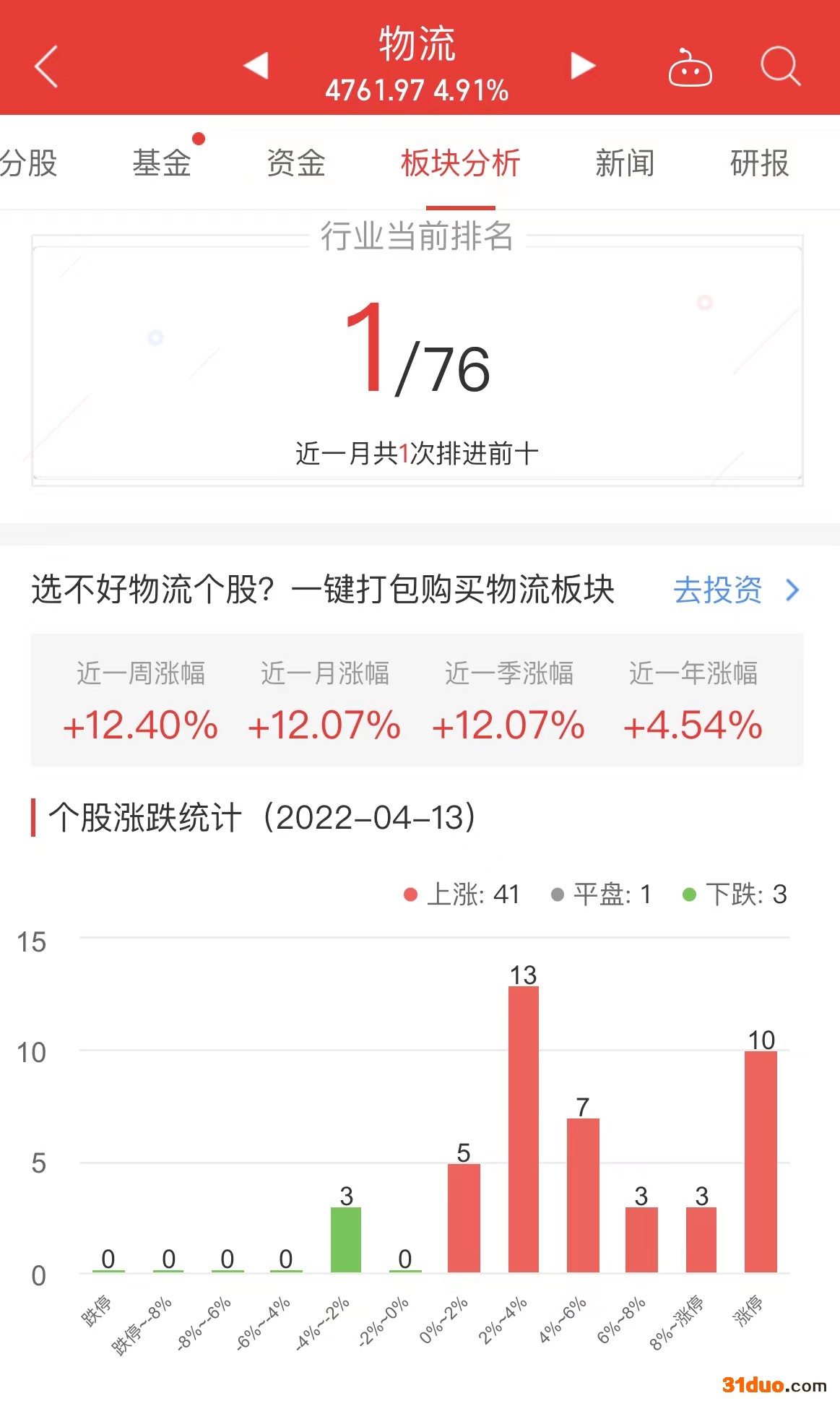 中国经济网北京4月13日讯 今日,物流板块整体涨幅4.91%,居行业排名榜首,其中41只股票上涨,1只股票平盘,3只股票下跌。
