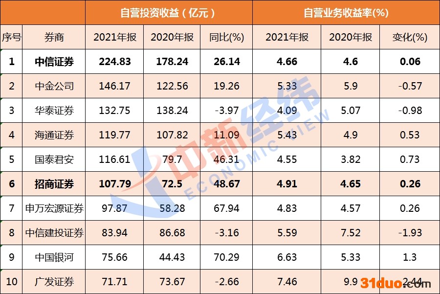 截至2022年4月13日,2021年自营投资收益排名前十的券商。数据来源:Wind