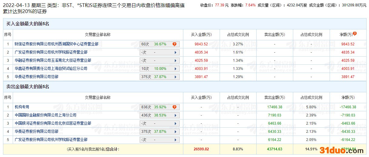 中国经济网北京4月13日讯 截至今日收盘,奥翔药业(603229.SZ)收报77.39元,涨幅7.64%。龙虎榜数据显示,卖出奥翔药业金额最大的